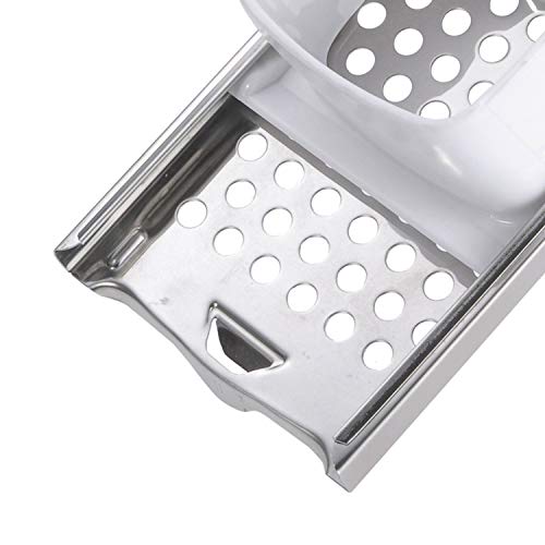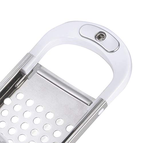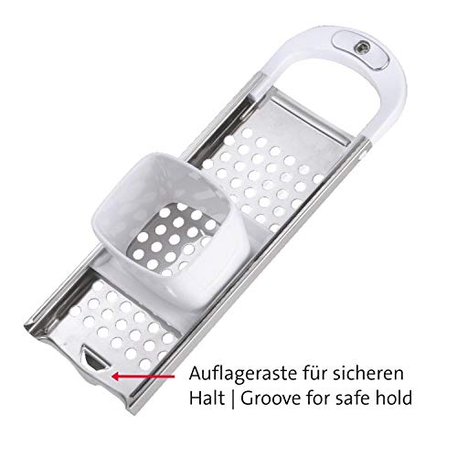 Handrasp met deegschuif voor het eenvoudig en snel maken van Spätzle en Knöpfle; geschikt voor alle soorten deeg – Eenvoudige productie van Knöpfle en Spätzle in slechts enkele minuten door het vullen van de schuif met deeg (inhoud ca. 250 ml) om deze vervolgens heen en weer te schuiven op de geperforeerde plaat – Optimale stabiliteit tijdens de bereiding dankzij de steunbeugel voor potten en schalen (diameter tot 24 cm); goede grip dankzij het afgeronde handvat van hoogwaardige kunststof met ophangoogje – Geen wegvloeien van het deeg dankzij de vlakke afwerking tussen de deegschuif en de zijkantet; eenvoudige reiniging dankzij de uitneembare deegschuif; vaatwasserbestendig – Inhoud: 1x Westmark Spätzle-schaaf Knöpfle; afmetingen: 32 x 10,8 x 6,8 cm; gewicht: 280 g; materiaal: roestvrij staal/kunststof (ABS); kleur: wit/zilver; 61122270