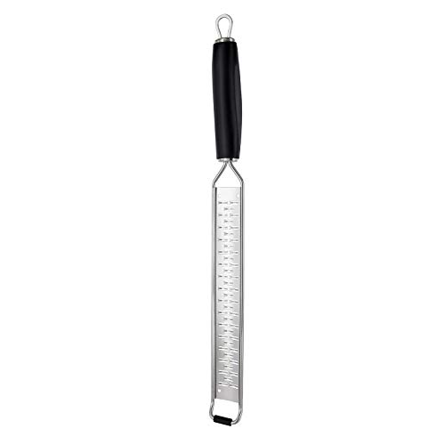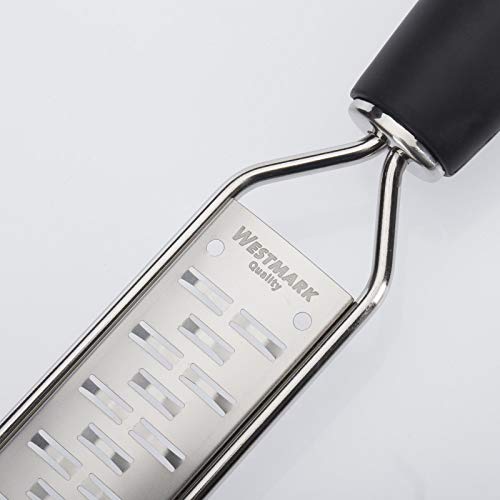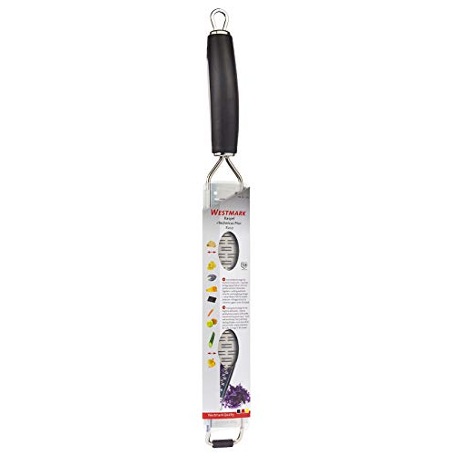 Professionele handrasp voor het snel en eenvoudig bereiden van citroenzeste en het raspen van fruit, chocolade of kruiden; voor gebruik in de horeca of thuis – Zeer scherp voor mooi raspen zonder pletten of vermalen dankzij de speciaal gevormde roestvrijstalen mesjes; moeiteloos in slechts enkele minuten bereiden van geraspt voedsel met een vol aroma – Goede grip op gladde oppervlakken dankzij onderkant met antislip; afgerond handvat van hoogwaardig kunststof met ophangoogje; compact formaat voor ruimtebesparende opslag aan de muur of in een lade – Duurzaam, zorgvuldig en stevig vakmanschap; eenvoudig te reinigen: vaatwasserbestendig – Inhoud: 1x Westmark Rasp Technicus-Pro; 5 jaar garantie; afmetingen: 39,9 x 3,6 x 2,8 cm; materiaal: roestvrij staal/kunststof (TPE); kleur: zilver/zwart; 14262270