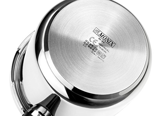 Monix Quick snelkookpannenset, 4 en 6 liter. Geschikt voor alle soorten kookplaten, inclusief inductievelden. Grote koks, die zowel de traditionele als de avantgardistische keuken verdedigen, gebruiken elke dag snelkookpannen om belangrijke redenen zoals tijdbesparing, behoud van vitaminen en de integriteit van de levensmiddelen. Bij het koken van levensmiddelen – het kookproces waarbij de meeste vitaminen verloren gaan – zonder snelkookpan kunnen zowel de smaak als de voedingsstoffen verdwijnen. Bij het koken met snelkookpannen wordt dit proces aanzienlijk verkort, zodat dit verlies zo klein mogelijk wordt gehouden. Zoals te zien in de afbeeldingen, heeft alleen de 6Liter pan een deksel.